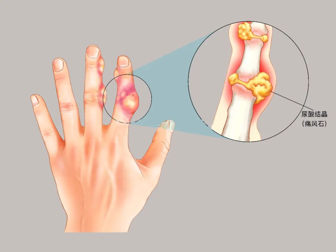 当尿酸盐结晶沉积在骨关节时,会刺激关节出现炎症,炎症反复发作发展为慢性痛风性关节炎,使发作更加频繁、间歇期更短、疼痛更剧,最终很容易诱发关节的破坏与畸形。